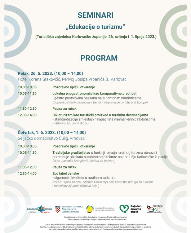 od 10,00 do 14,00 sati (petak i četvrtak). Predavanja će se održavati dana 26. svibnja 2023. u Hotelu Korana Srakovčić, Perivoj Josipa Vrbanica 8, Karlovac od10 do 14 sati i 1. lipnja 2023. u Seljačkom domaćinstvu Čulig, Vrhovac od 10,00 do 14,00 sati. Organizator edukacija koje sufinancira Hrvatska turistička zajednica je Turistička zajednica Karlovačke županije, a provodi ih Hrvatska udruga za turizam i ruralni razvoj „Klub članova Selo“.