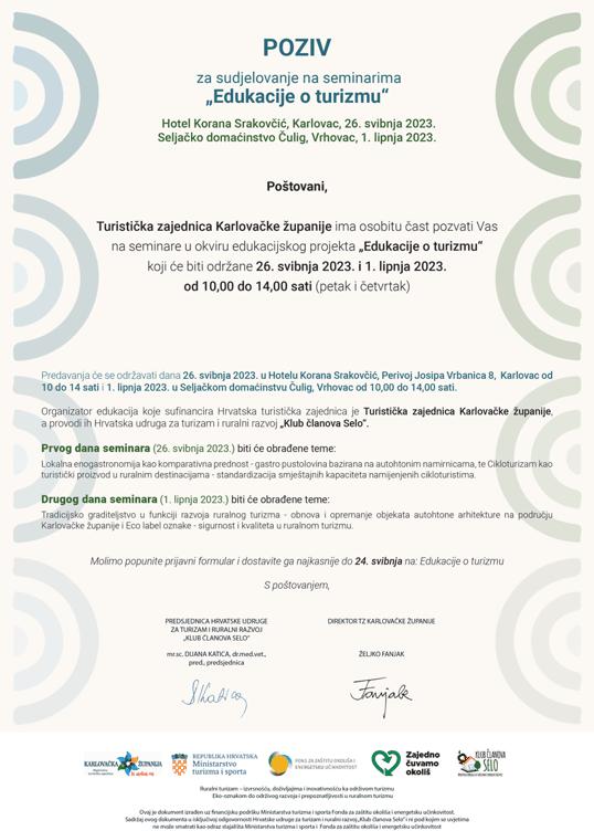 Turistička zajednica Karlovačke županije ima osobitu čast pozvati Vas na seminare u okviru edukacijskog projekta „Edukacije o turizmu“ koji će biti održane 26. svibnja 2023. i 1. lipnja 2023.